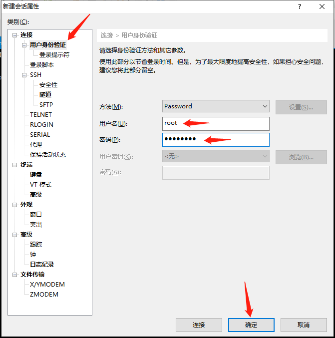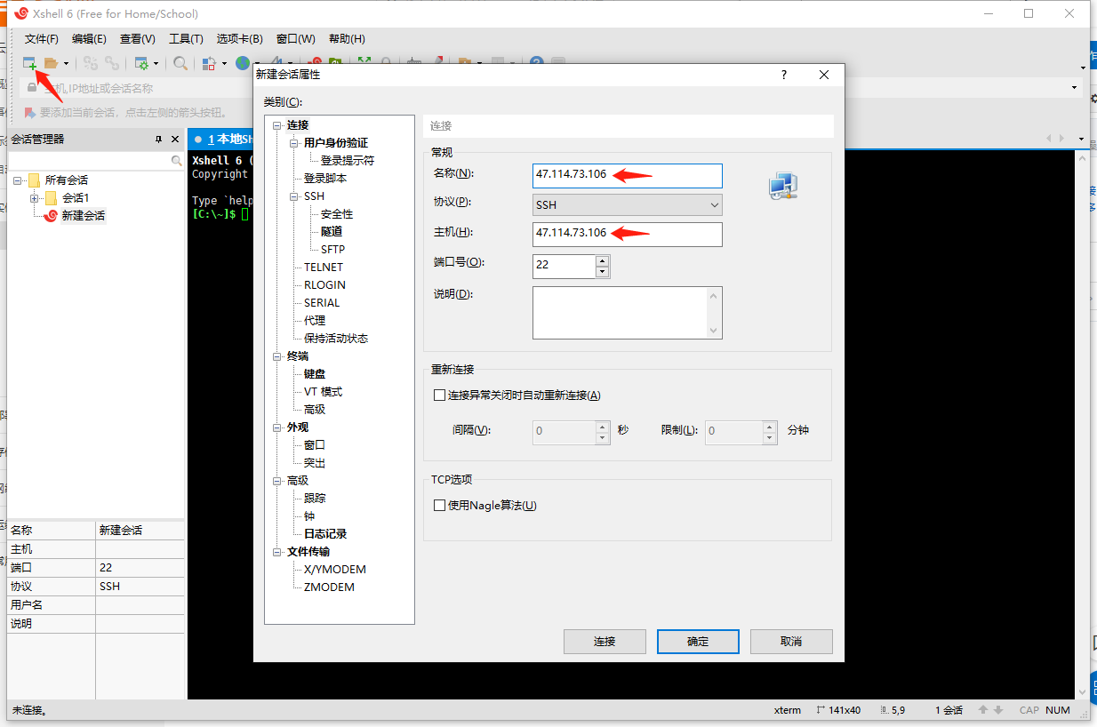 1、新建会话,填写服务器的IP地址。