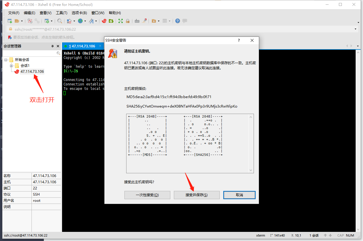 3、打开刚刚添加的会话,第一次访问时点击“接受并保存”。