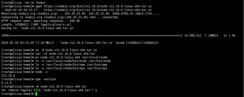cd /home/ wget https://nodejs.org/dist/v12.16.0/node-v12.16.0-linux-x64.tar.xz
