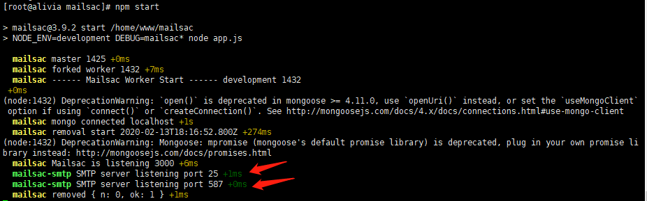 # 如果刚刚执行过启动命令,就不需要执行这2条命令。 cd /home/www/mailsac pm2 start app.js # 保存应用列表 pm2 save # 设置开机启动 pm2 startup