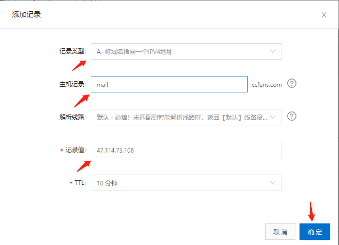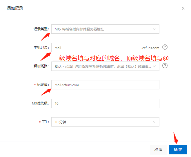主机记录填写“@”,记录值填写“mail.ccfuns.com”,那么最终域名mail.ccfuns.com,邮箱后缀@ccfuns.com。