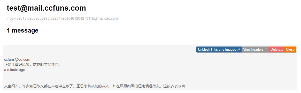 点击查看邮件内容。(当前仅能收到文本邮件,无法查看附件。但是附件会编码成base64,你也可以自行解码,点击View headers,查看邮件报文。你也可以将报文内容存储为eml文件,并通过其他邮件软件进行导入。发送较大附件时很慢。仅是测试,也不考虑做附件的二次开发,拜拜!)