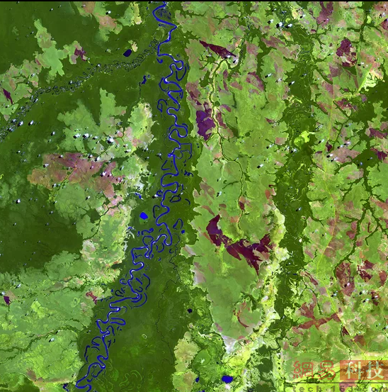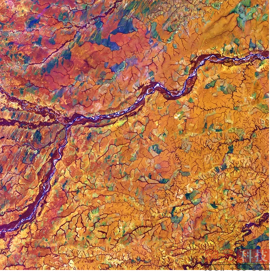 镶嵌艺术:2014年9月2日在巴西伊比廷加(Ibitinga)附近拍摄的卫星图片显示,Tietê河蜿蜒流过。图中,可以看到呈现不同成长阶段的甘蔗、花生以及玉米田。这些长势喜人的作物在图中呈现出紫色和蓝色,很少或根本没有植被生长的地方呈现出浅黄色或白色。城区则呈现暗褐色。