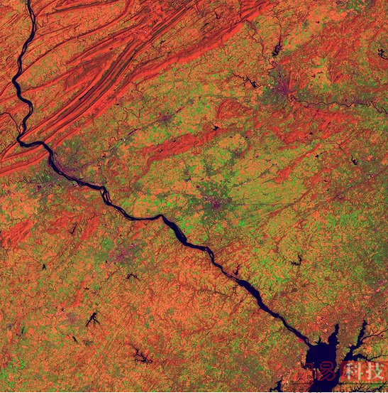 河流与山脊:2014年4与24日拍摄的照片显示,萨斯奎哈纳河(Susquehanna River)看起来就像一条黑暗的线穿过宾夕法尼亚州东南部。美国地质调查局称:“约克、兰开斯特以及雷丁等城市都位于农田包围之中。宾州首府哈里斯堡(Harrisburg)位于图中左上角的橙色褶皱上,附近是阿巴拉契亚山岭和谷区(Appalachian Mountain Ridge Valley Province)边缘。”