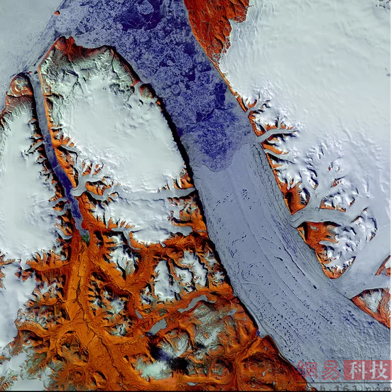 彼得曼冰川(Petermann Glacier):彼得曼冰川位于格陵兰岛海岸,覆盖面积1295平方公里。冰川浮动的舌头从图片右下角延伸到中上部,红褐色色调是裸露的地表。这张照片拍摄于2014年6月24日。