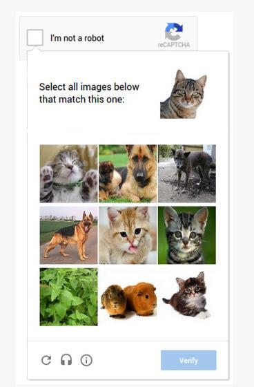如果noCAPTCHA认为你是真人,那就不用再做什么了,这确实很容易。如果noCAPTCHA认为你不是真人,它就会要求你填一个传统的CAPTCHA字符串或更先进的字符串,比如从一组图片中挑选出正确的图片。